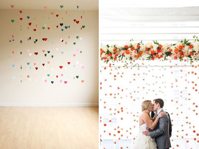 Bạn nghĩ rằng những chiếc rèm chỉ nên để ở trong phòng. Nhưng với rèm lụa trái tim thì khác, chúng hoàn toàn có thể trở thành một backdrop đầy ấn tượng cho ngày cưới. Những chiếc rèm kim tuyến hay rèm trái tim sẽ khiến bạn có cảm giác không gian trở nên thoáng và rộng rãi hơn. Không chỉ vậy chúng còn có thể tạo phông cho bạn gắn thêm các chi tiết khác như chữ, hình trang trí phù hợp.