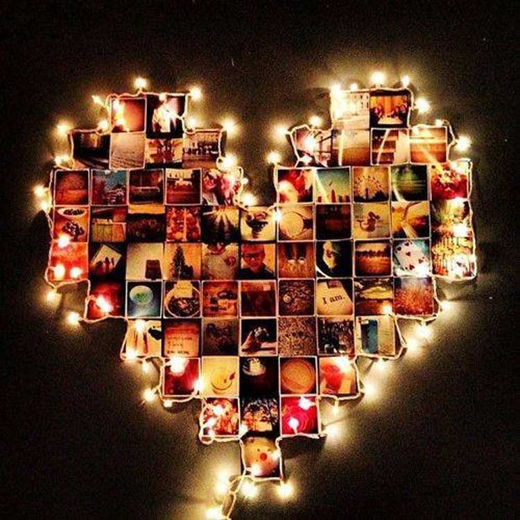 Hãy thử ghép những bức ảnh thành hình trái tìm lên tường rồi dùng dây đèn led quấn quanh để trang trí. Bạn sẽ bị bất ngờ bởi kết quả đạt được đấy.
