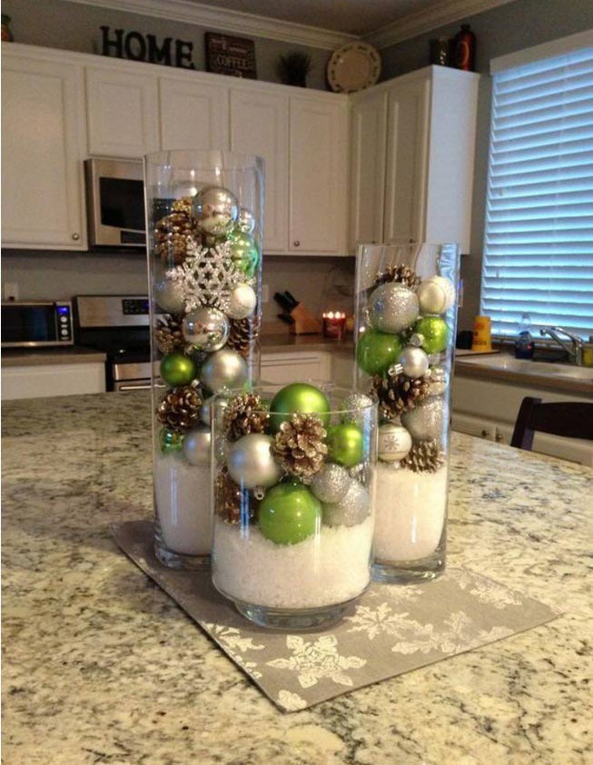 Các bình hình trụ, dáng dài cũng là một trong những phương thức lý tưởng để trang trí các quả bóng giáng sinh. 3 cái lọ với các kích thước khác nhau sẽ cho hiệu ứng đẹp hơn: 2 cái dài cao (1 cái cao và 1 cái trung bình), 1 cái bình thấp có đường kính lớn hơn.