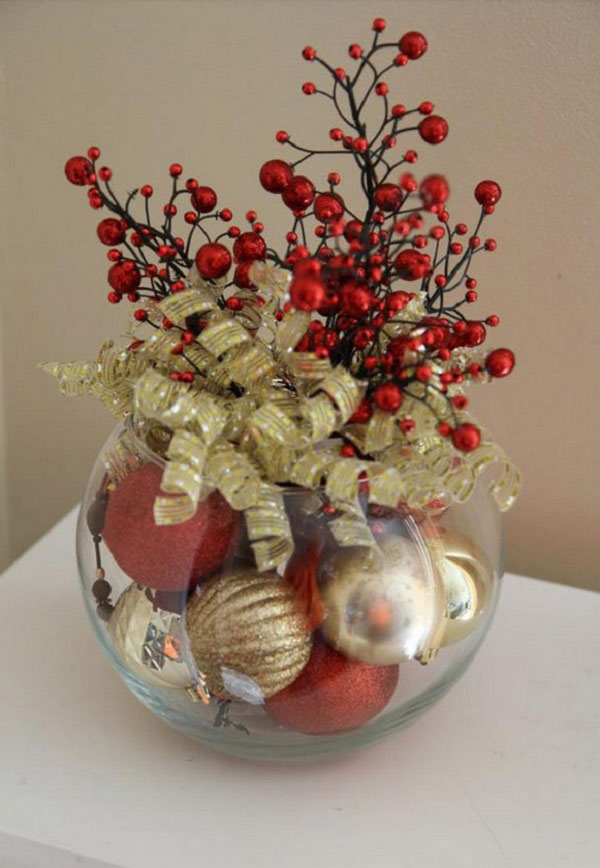Rất đơn giản, bạn chỉ cần đặt những quả bóng bên trong bình, trang trí thêm những quả thông, lá tầm gửi và 1 số đồ trang trí khác. Quấn 1 sợi dây thừng nhỏ quanh bình nhiều lần và thắt nơ lại.
