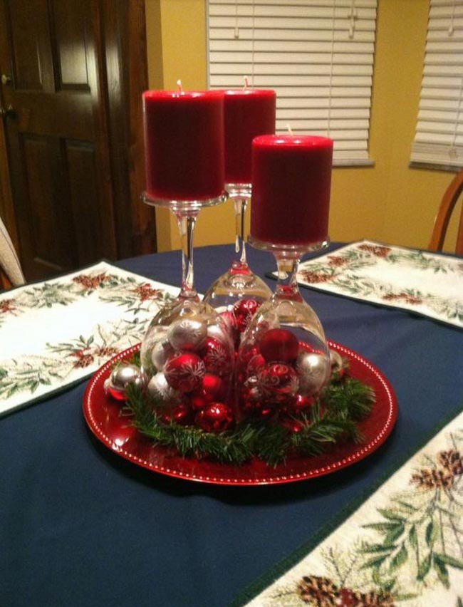 Cách trang trí này vô cùng đơn giản với ly rượu, những quả bóng giáng sinh và nến. Chúng ta sẽ bắt đầu bằng việc cho những quả bóng vào trong ly rượu.