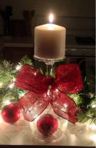 Đầu tiên ta đặt quả bóng vào giữa ly rượu rồi lật ngược nó xuống và đặt cây nến lên đế ly. Thắt chiếc nơ vào phần cổ ly rồi trang trí thêm xung quanh là những cành thông xanh biếc. Thắp đèn lên và mọi thứ trông sẽ rất lung linh, đẹp mắt.