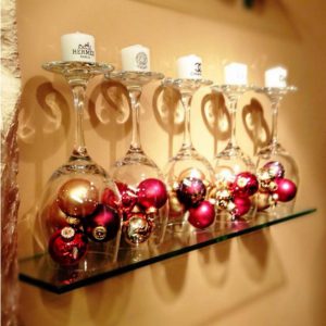 Đây là một ý tưởng tuyệt vời để trang trí đỉnh của lò sưởi. Để trang trí này bạn cần chuẩn bị 1 quả bóng Giáng Sinh, 1 ly rượu, 1 chiếc nơ lớn, cây nến và những cành thông nhân tạo.