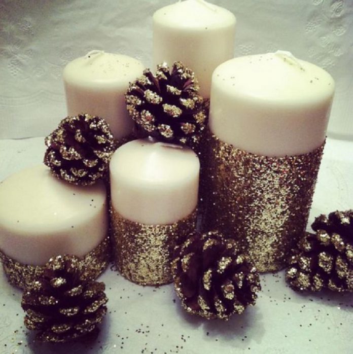 Cách trang trí này rất đơn giản, bạn chỉ cần chuẩn bị thật nhiều những cây nến thơm lớn màu trắng với các kích thước khác nhau. Sau đó dùng keo Mod Podge để phủ 1 lớp kim tuyến long lanh đến nửa chừng cây nến.