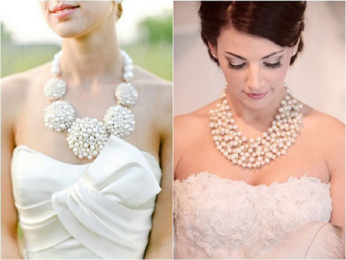 Cô dâu có thể lựa chọn những chiếc vòng cổ theo sở thích nhưng nhớ vẫn phải đảm bảo sao cho hợp với váy cưới và màu da nhất nhé. Những chiếc vòng cổ lớn thích hợp hơn với váy cúp ngực để hở bờ vai trần.