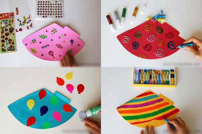 Bước 2: Tương tự như thế chúng mình cùng làm tương tự với những tờ bìa màu sắc còn lại. Công đoạn bây giờ là tô màu trang trí, mỗi nón 1 kiểu cho đẹp các mẹ nhé.