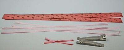 Cắt ruy-băng bản rộng 2,5cm thành 2 đoạn, mỗi đoạn dài 15,5cm, cắt dây ruy-băng bản rộng 1,5cm thành 2 đoạn, mỗi đoạn dài 13cm. Cắt dây ruy-băng bản rộng 0,5cm thành 2 đoạn, mỗi đoạn dài 4cm.