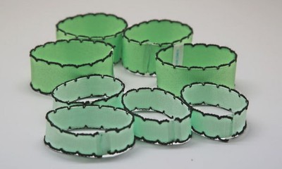 - Bước 1: Cắt dây ruy-băng màu xanh bản 2,5cm thành 4 đoạn dài 18cm và cắt dây ruy-băng màu xanh bản 0,5cm thành 4 đoạn 16cm. Dây ruy-băng màu đen cắt thành 1 đoạn dài 4,5cm. Dán 2 đầu dây ruy-băng lại thành ống tròn. Áp dụng cho tất cả số ruy-băng mà bạn đã cắt.
