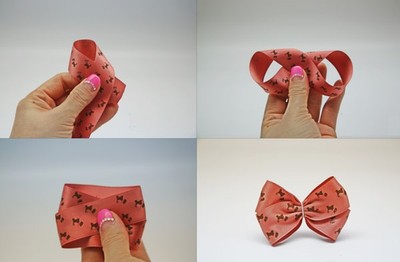 Gấp xoắn 2 đầu dây ruy-băng bản rộng 2,5cm vào trong tạo hình số 8. Dán băng dính cố định 2 đầu vải, sau đó gấp đôi hình số 8 sao cho điểm giao nhau giữa số 8 chồng lên trên hai đầu số 8. Cắt sợi chỉ thành đoạn dài. Buộc cố định giữa điểm giao nhau và hai đầu của số 8 tạo hình chiếc nơ.