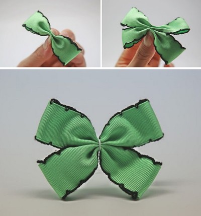 - Gấp xếp ly giữa vòng số 8 dây ruy-băng bản rộng 2,5cm. Đặt hai vòng dây đã xếp ly cạnh nhau tạo hình chiếc nơ lớn. Cố định giữa chiếc nơ bằng chỉ.