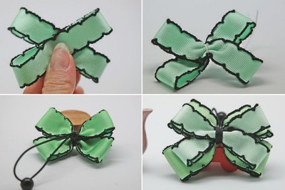 - Tiếp theo, đặt chồng 2 vòng số 8 dây ruy-băng bản rộng 1,5cm lên nhau. Tạo thành hình chữ X nằm ngang và quấn cố đinh giữa chữ X tạo thành hình nơ nhỏ bằng dây chỉ. Đặt nơ nhỏ lên nơ lớn,dán ruy-băng đen cố định giữa 2 chiếc nơ rồi dán chiếc nơ đó lên dây cột tóc đã chuẩn bị là xong.