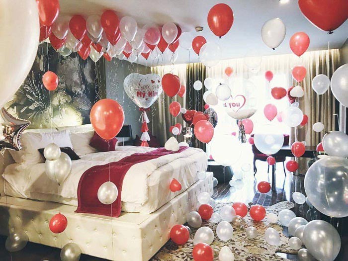 Còn gì ngọt ngào hơn khi được tự tay chuẩn bị một buổi tối thật lãng mạn và bất ngờ cho cô gái của mình. Những quả bóng màu sắc khác nhau được cột dây ruy băng và thả bay lên trên trần nhà.