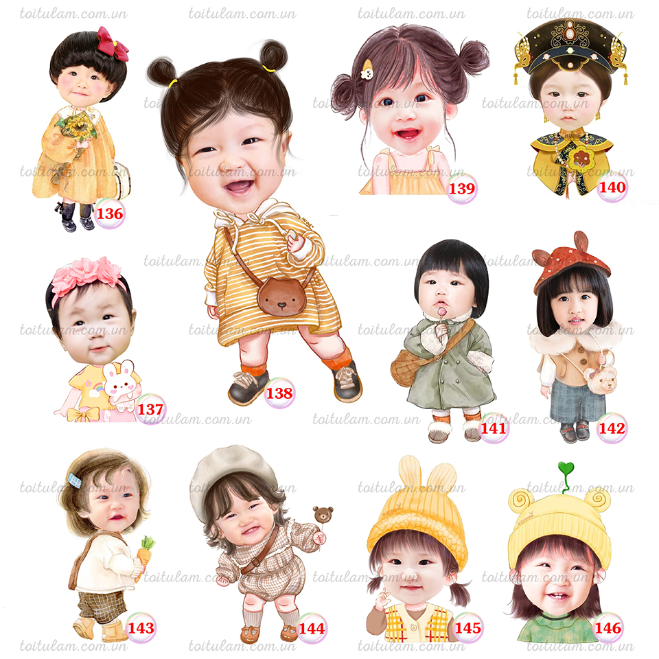 Phần thân Chibi lựa chọn thiết kế theo hình ảnh của các nhân vật (Ví dụ: Bé gái là hình công chúa, thiên thần, bé trai là siêu nhân, lính cứu hoả)