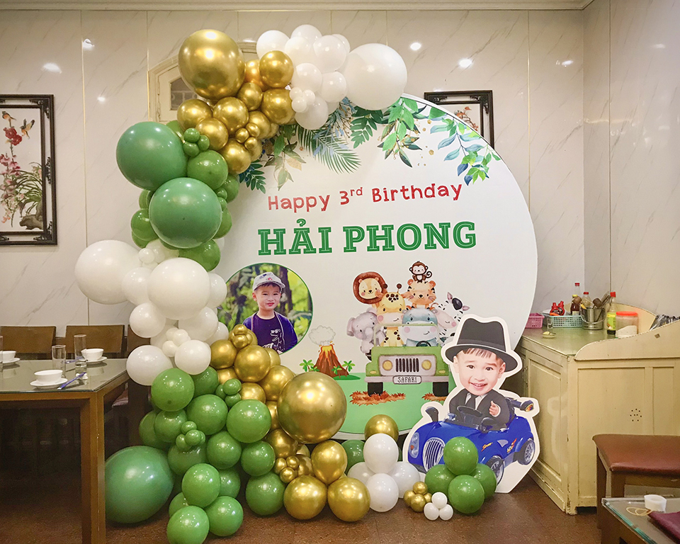 Set bóng trang trí sinh nhật chủ đề động vật tông xanh lá - vàng đồng kèm chibi Baby Boss bé lái ô tô