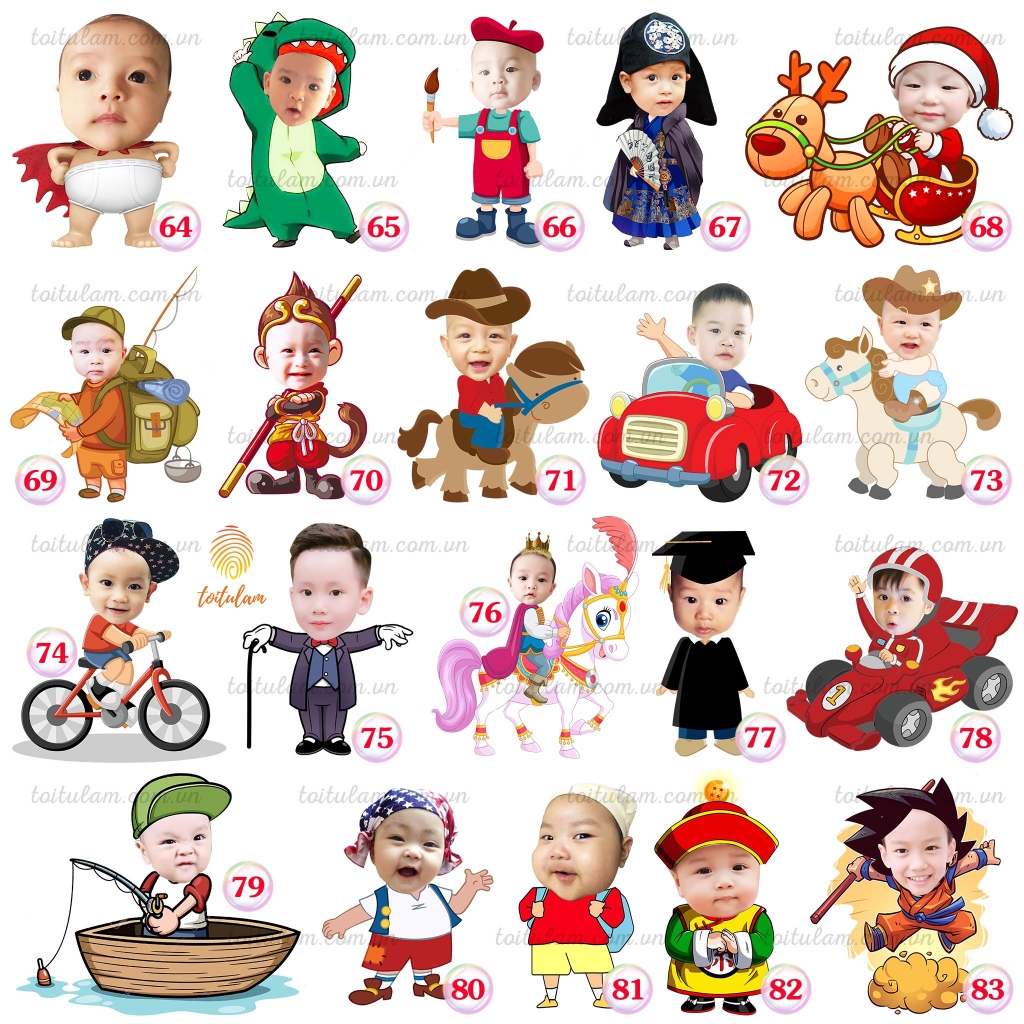 Phần thân Chibi lựa chọn thiết kế theo hình ảnh của các nhân vật (Ví dụ: Bé gái là hình công chúa, thiên thần, bé trai là siêu nhân, lính cứu hoả)