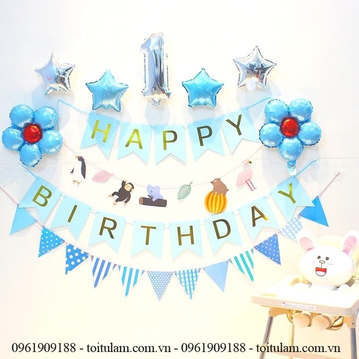 Set dây chữ Happy Birthday tone màu xanh chủ đạo với nhiều phụ kiện sinh nhật bao gồm: Dây chữ Happy Birthday cao cấp, hình các con thú đáng yêu, những ngôi sao lấp lánh, bông hoa, bóng bay sắc màu.