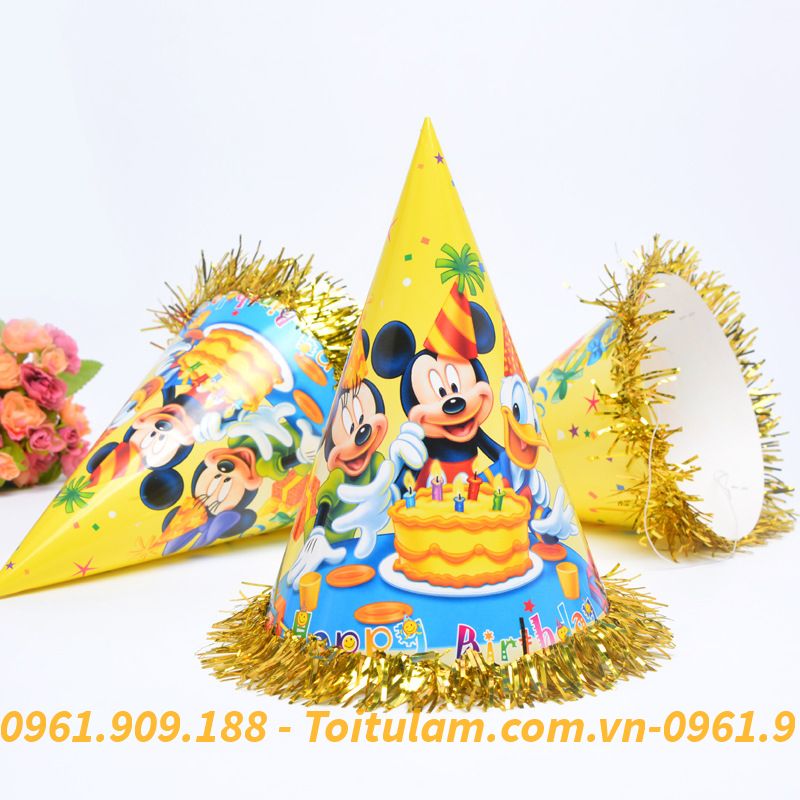 Mũ sinh nhật dành cho bé & các bạn đội trong các bữa tiệc, dịp lễ. Giúp không gian trở nên sinh động, đáng nhớ & những bức hình đẹp. Mũ bằng bìa cứng có quai bằng chun đeo phù hợp cho tất cả các bé. Các bé nhà bạn sẽ thích mê với những chiếc mũ giấy (nón chóp) nhiều hình ngộ nghĩnh. Buổi sinh nhật thêm rộn ràng niềm vui và hạnh phúc