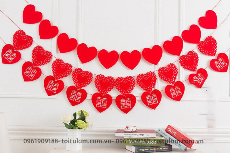 Dây hỷ đám cưới tại Toitulam làm bằng mếch hoặc nhựa và có nhiều thiết kế hiện đại độc đáo, phù hợp để treo trần, treo tường.