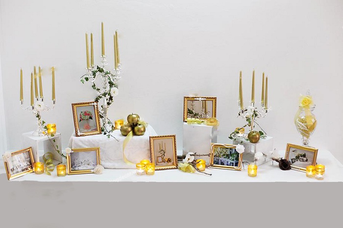 Bàn Gallery với nến, khung ảnh và những quả táo bằng vàng