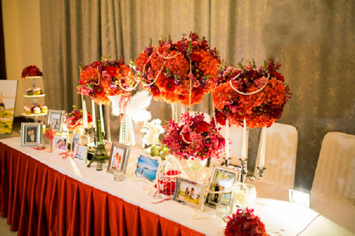 Bàn Gallery rực sắc đỏ với hoa và nến lung linh
