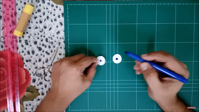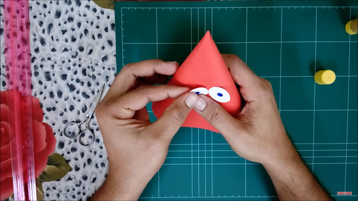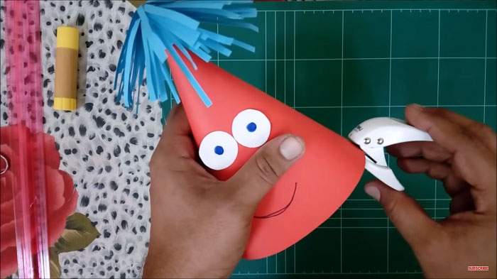 Bước 4: Dùng kéo và compa cắt 2 hình tròn nhỏ màu trắng làm mắt, dùng bút tô cho mắt và dán chúng lên cho chiếc mũ sinh nhật handmade.