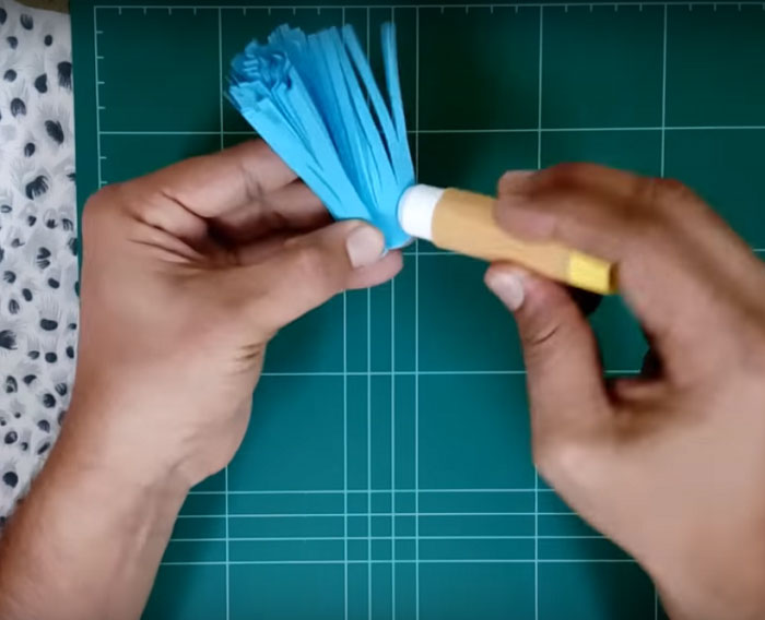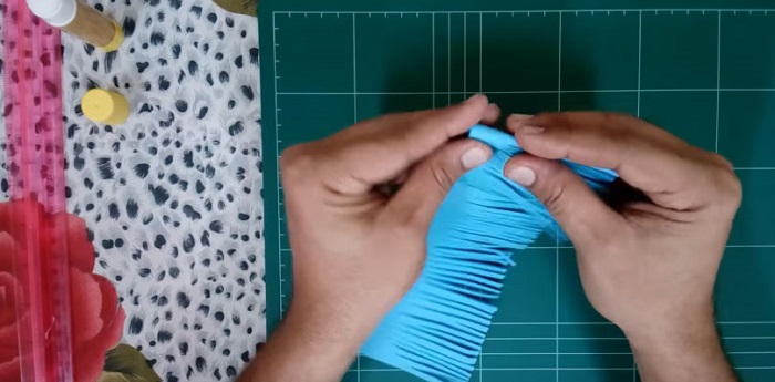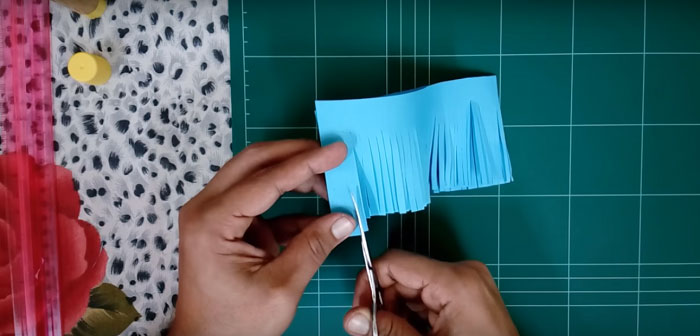Bước 5: Lấy 1 đoạn giấy màu xanh dài gập đôi, cắt tạo tua rua.