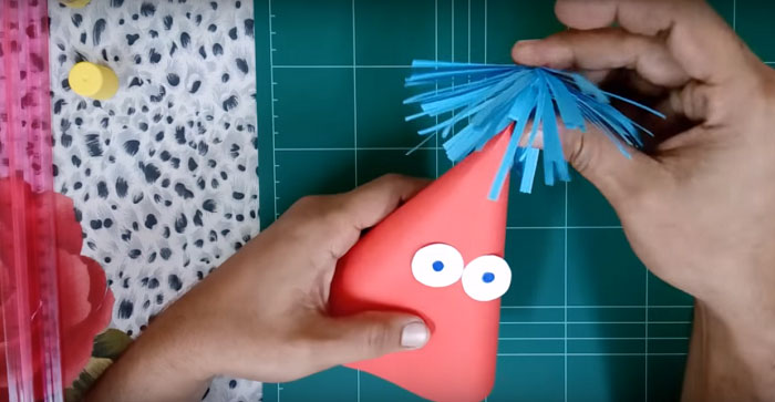 Bước 7: Bôi keo lên phần chóp mũ và dán tua rua đã cắt.