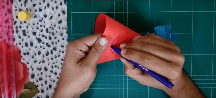 Bước 3: Bôi keo vào đường viền và cuộn giấy lại tạo thành hình chóp, dán để mũ được cố định.