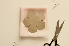 Bước 2: Lấy một ít vải, gấp thành hình vuông rộng hơn hình bông hoa mẫu một chút rồi lấy đinh ghim ghim chặt vào mẫu và cắt mảnh vải theo khuôn đã vẽ. Cứ tiếp tục cắt nhiều lần cho đến khi đủ số hoa muốn làm. Bạn có thể cắt cả từ vải voan và tuyn.