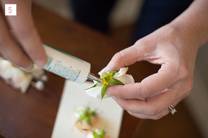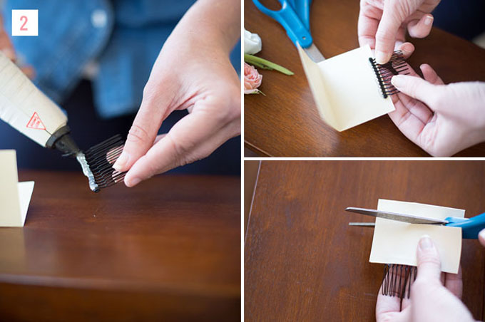 - Bước 5: Dùng keo dán vào cuống hoa và đính chúng lên trên lược cài. Lấy tay ấn để cố định hoa trên lược trong khoảng từ 15 – 20 giây.