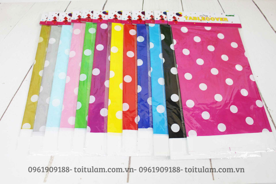 Với chất liệu bằng nilon, rất dễ dàng trong việc làm sạch và tái sử dụng, kích thước dài 1m8, ngang 1m3, với rất nhiều mẫu là họa tiết chấm bi, hình theo chủ đề, khăn trải bàn trơn, bao gồm các màu trắng, xanh dương, xanh lá cây, hồng,...rất nhiều màu để các bố, các mẹ lựa chọn cho phù hợp với chủ đề của bữa tiệc và sở thích của các bé.