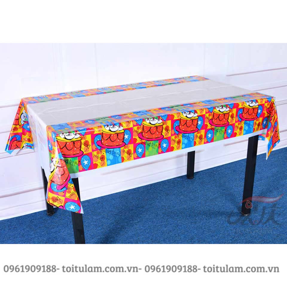 Với chất liệu bằng nilon, rất dễ dàng trong việc làm sạch và tái sử dụng, kích thước dài 1m8, ngang 1m3, với rất nhiều mẫu là họa tiết chấm bi, hình theo chủ đề, khăn trải bàn trơn, bao gồm các màu trắng, xanh dương, xanh lá cây, hồng,...rất nhiều màu để các bố, các mẹ lựa chọn cho phù hợp với chủ đề của bữa tiệc và sở thích của các bé.