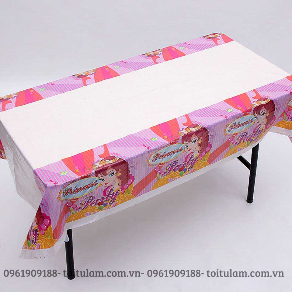 Với chất liệu bằng nilon, rất dễ dàng trong việc làm sạch và tái sử dụng, kích thước dài 1m8, ngang 1m3, với rất nhiều mẫu là họa tiết chấm bi, hình theo chủ đề, khăn trải bàn trơn, bao gồm các màu trắng, xanh dương, xanh lá cây, hồng,...rất nhiều màu để các bố, các mẹ lựa chọn cho phù hợp với chủ đề của bữa tiệc và sở thích của các bé.