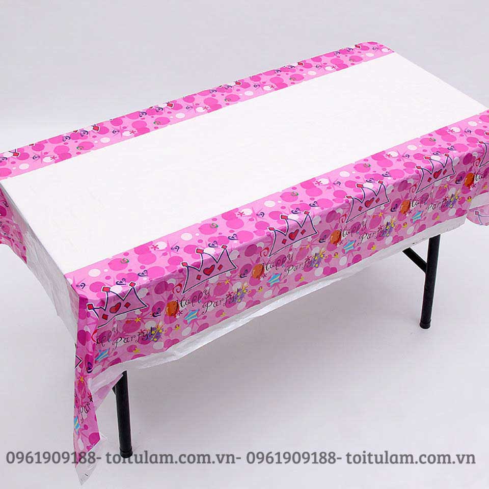 Với chất liệu bằng nilon, rất dễ dàng trong việc làm sạch và tái sử dụng, kích thước dài 1m8, ngang 1m3, với rất nhiều mẫu là họa tiết chấm bi, hình theo chủ đề, khăn trải bàn trơn, bao gồm các màu trắng, xanh dương, xanh lá cây, hồng,...rất nhiều màu để các bố, các mẹ lựa chọn cho phù hợp với chủ đề của bữa tiệc và sở thích của các bé.