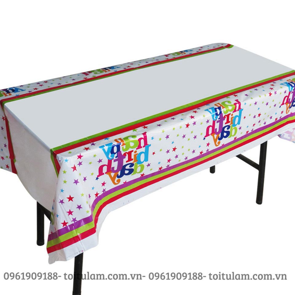 Với chất liệu bằng nilon, rất dễ dàng trong việc làm sạch và tái sử dụng, kích thước dài 1m8, ngang 1m3, với rất nhiều mẫu là họa tiết chấm bi, hình theo chủ đề, khăn trải bàn trơn, bao gồm các màu trắng, xanh dương, xanh lá cây, hồng,...rất nhiều màu để các bố, các mẹ lựa chọn cho phù hợp với chủ đề của bữa tiệc và sở thích của các bé.