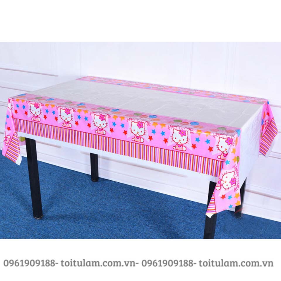 Với chất liệu bằng nilon, rất dễ dàng trong việc làm sạch và tái sử dụng, kích thước dài 1m8, ngang 1m3, với rất nhiều mẫu là họa tiết chấm bi, hình theo chủ đề, khăn trải bàn trơn, bao gồm các màu trắng, xanh dương, xanh lá cây, hồng,...rất nhiều màu để các bố, các mẹ lựa chọn cho phù hợp với chủ đề của bữa tiệc và sở thích của các bé.