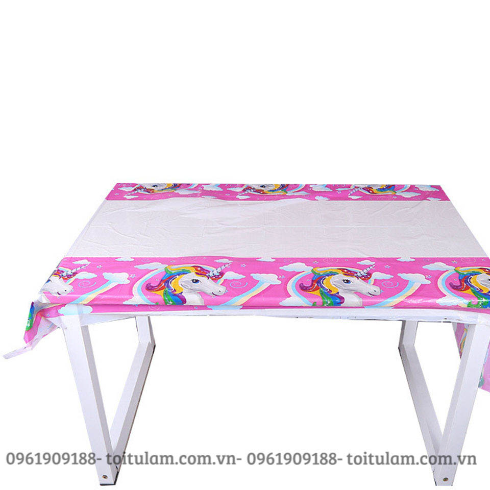 Với chất liệu bằng nilon, rất dễ dàng trong việc làm sạch và tái sử dụng, kích thước dài 1m8, ngang 1m3, với rất nhiều mẫu là họa tiết chấm bi, hình theo chủ đề, khăn trải bàn trơn, bao gồm các màu trắng, xanh dương, xanh lá cây, hồng,...rất nhiều màu để các bố, các mẹ lựa chọn cho phù hợp với chủ đề của bữa tiệc và sở thích của các bé.