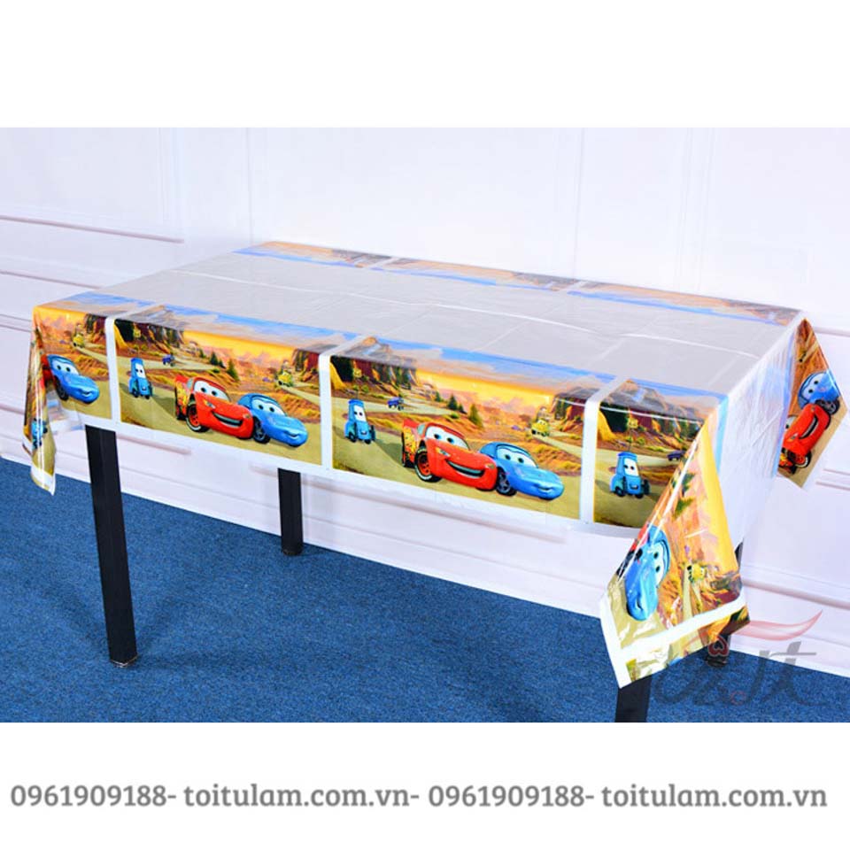 Với chất liệu bằng nilon, rất dễ dàng trong việc làm sạch và tái sử dụng, kích thước dài 1m8, ngang 1m3, với rất nhiều mẫu là họa tiết chấm bi, hình theo chủ đề, khăn trải bàn trơn, bao gồm các màu trắng, xanh dương, xanh lá cây, hồng,...rất nhiều màu để các bố, các mẹ lựa chọn cho phù hợp với chủ đề của bữa tiệc và sở thích của các bé.