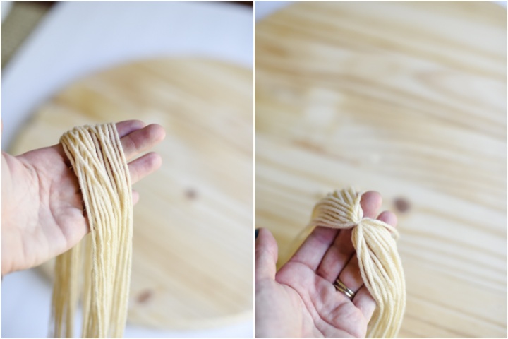 Bước 2: Xác định điểm chính giữa bó len vừa cắt, rồi dùng dây buộc chặt bó len tại điểm đó.
