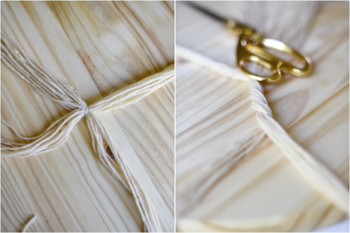 Lưu ý: bạn cũng có thể chia len thành 3 bó nhỏ đều nhau để tạo 3 cạnh giữ gỗ nha!
