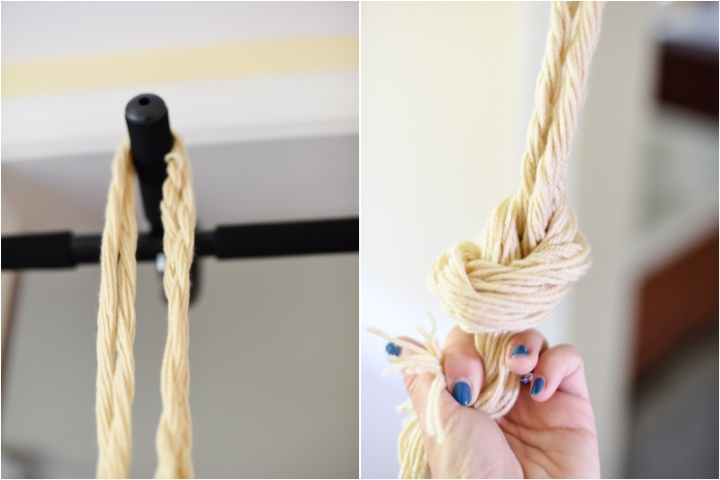Bước 4: Vắt len qua thanh treo rèm hoặc 1 vị trí chắc chắn bạn định đặt kệ treo cây. Sau đó chắp 4 bó lại thắt nút hoặc buộc lại tại điểm cách đỉnh 10 cm.