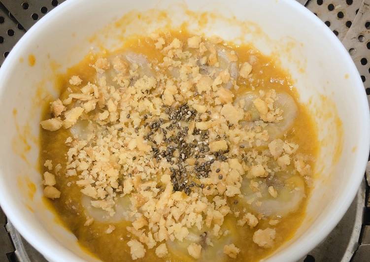 - Bí ngô hấp chín, nghiền nhuyễn. Phô mai cũng nghiền nhuyễn ra