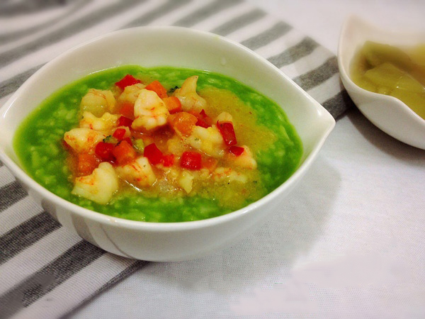 - Cải xoăn rửa sạch, xay rồi lọc lấy nước, bỏ bã. Khi cháo gần được thì đổ nước cải xoăn vào, khuấy đều