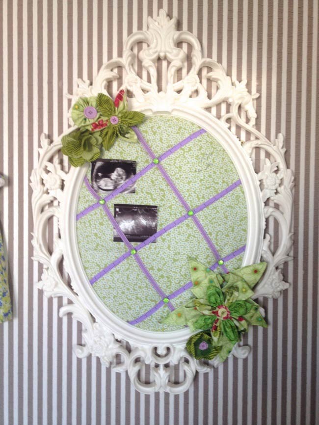 Nếu có một chiếc gương cũ, đừng vội vất đi bởi nó sẽ trở thành 1 khung ảnh mang đậm màu sắc cổ điển và là một vật rất thú vị để treo trong nhà đây. Bạn dùng vải bọc lấy khung gương. Tiếp đó, dùng ruy băng và keo dán tạo thành các đường ngang dọc và làm điểm đỡ cho các bức ảnh trên mặt vải. Cuối cùng, gài các tấm ảnh vào là xong. Cùng chiêm ngưỡng thành quả thôi nào!
