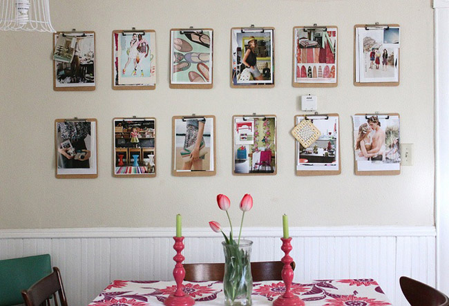 Các tấm bảng kẹp mang vẻ hiện đại và khá gọn gàng khi treo lên. Bạn chỉ cần đóng đinh hoặc dùng móc để treo tất cả chúng lên tường. Với cách treo ảnh này, bạn luôn có thể thay đổi ảnh rất dễ dàng so với các khung ảnh truyền thống.
