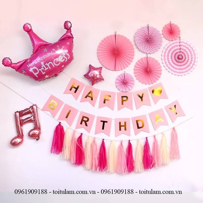 Đây là set dây chữ dành riêng cho công chúa nhỏ của bạn. Với tone màu hồng chủ đạo, bên cạnh dây chữ Happy Birthday còn có các phụ kiện khác như : Bóng hình vương miện công chúa, hình hoa rẻ quạt, nốt nhạc vui tươi và cả hình sao lấp lánh...