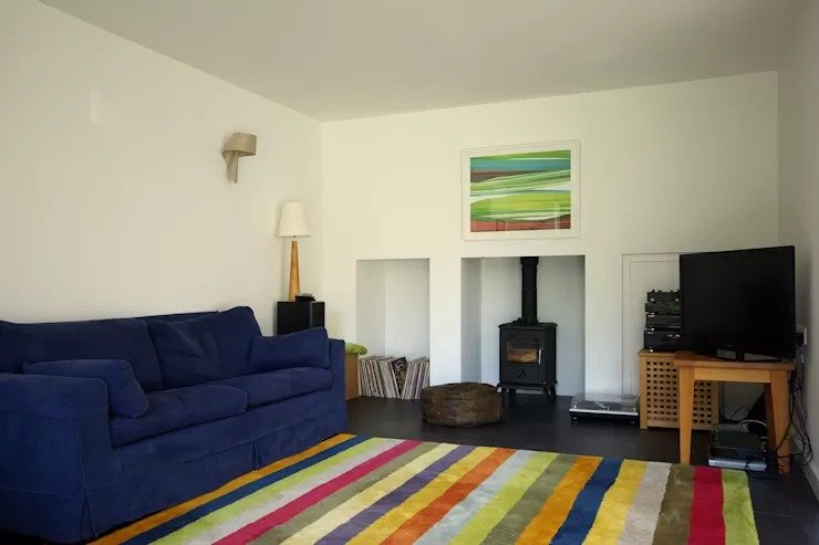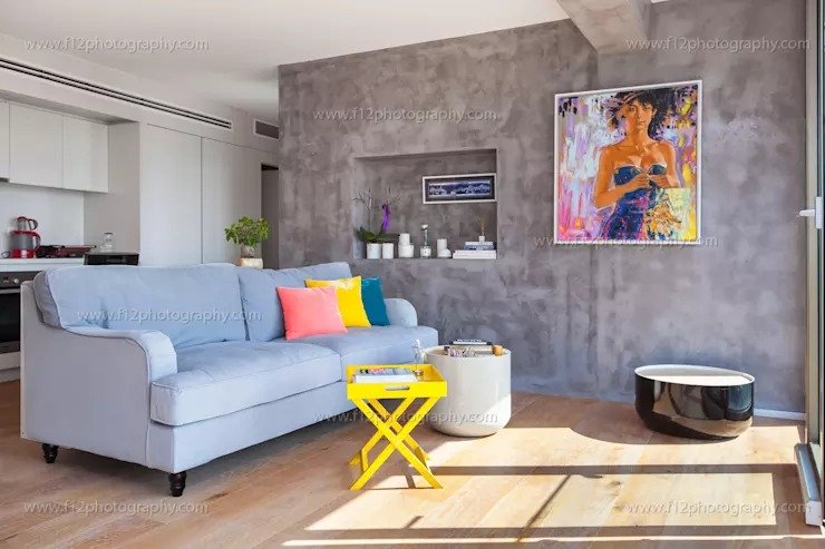 Với các phòng khách nhỏ, nhiều gia đình thường ưu tiên chọn những màu sắc sáng và trung tính. Tuy nhiên, một chút màu sắc nổi bật sẽ mang đến một kết quả rất bất ngờ. Hai chiếc ghế tựa lớn mà xanh lam sẽ trở nên rực rỡ và nổi bật hơn thay vì những ghế sofa màu kem nhạt. Một chiếc bàn trà có nhiều vạch màu đặt trước 1 tủ tường màu ghi xám cũng là một sự tương phản khá thú vị.