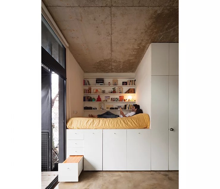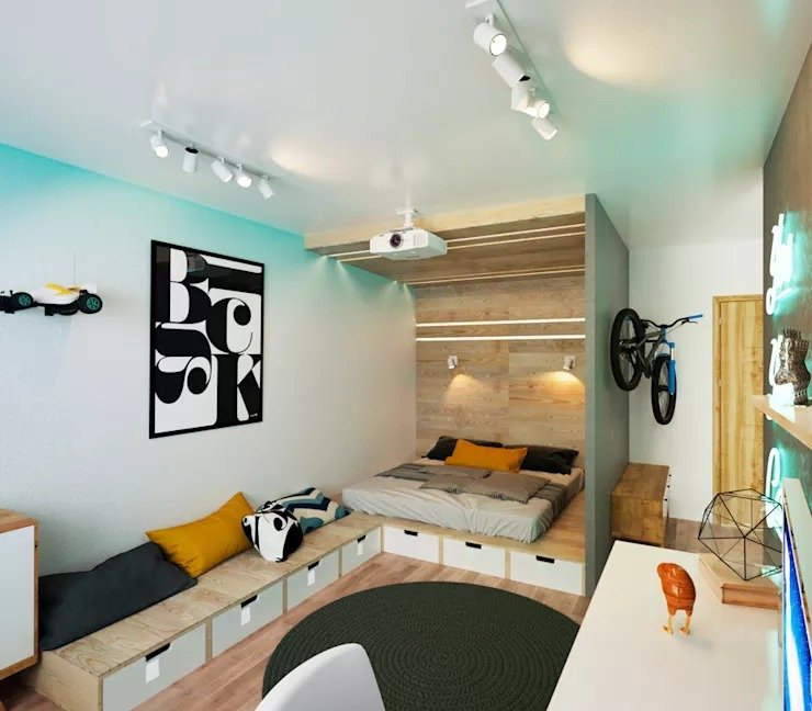 Đây là thiết kế tuyệt vời giúp bạn tiết kiệm các không gian cho phòng ngủ nhỏ với các thiết bị nội thất đa năng. Khung giường được thiết kế với các ngăn kéo gỗ dùng để chứa đồ vô cùng tiện lợi. Một điểm khá thú vị khác trong thiết kế này là màu sơn monochrome thời thượng, cách sắp xếp dàn đèn neon ở trên trần nhà và những món phụ kiện màu đen – trắng vô cùng hiện đại.