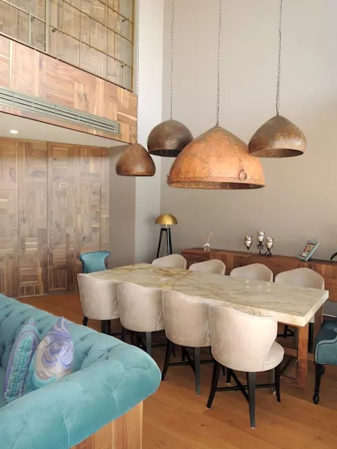 Phong cách nhà đẹp vintage cổ điển thường sử dụng các phụ kiện trang trí rất độc đáo. Bàn ăn bằng đá cẩm thạch dày đồng bộ với ghế ngồi làm tôn lên màu sắc của những chiếc ghế ngồi. Điểm nhấn chính của phòng ăn này chính là bộ đèn chùm chụp gỗ vừa lạ mắt vừa sang trọng này.