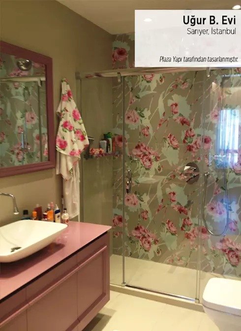 Bỏ qua phòng tắm sẽ làm bạn rất tiếc nuối nếu nhìn vào mẫu thiết kế dưới đây. Vẻ đẹp thẩm mỹ đã bao trùm cả không gian phòng tắm nhờ việc sử dụng các họa tiết hoa hồng trên khắn tắm và tường kính. Tủ đựng đồ tone màu hồng đồng bộ cũng khiến không gian trở nên lãng mạn và ngọt ngào hơn. Bạn cũng có thể lựa chọn một số màu sắc và họa tiết khác để phù hợp hơn với sở thích của các thành viên trong gia đình.